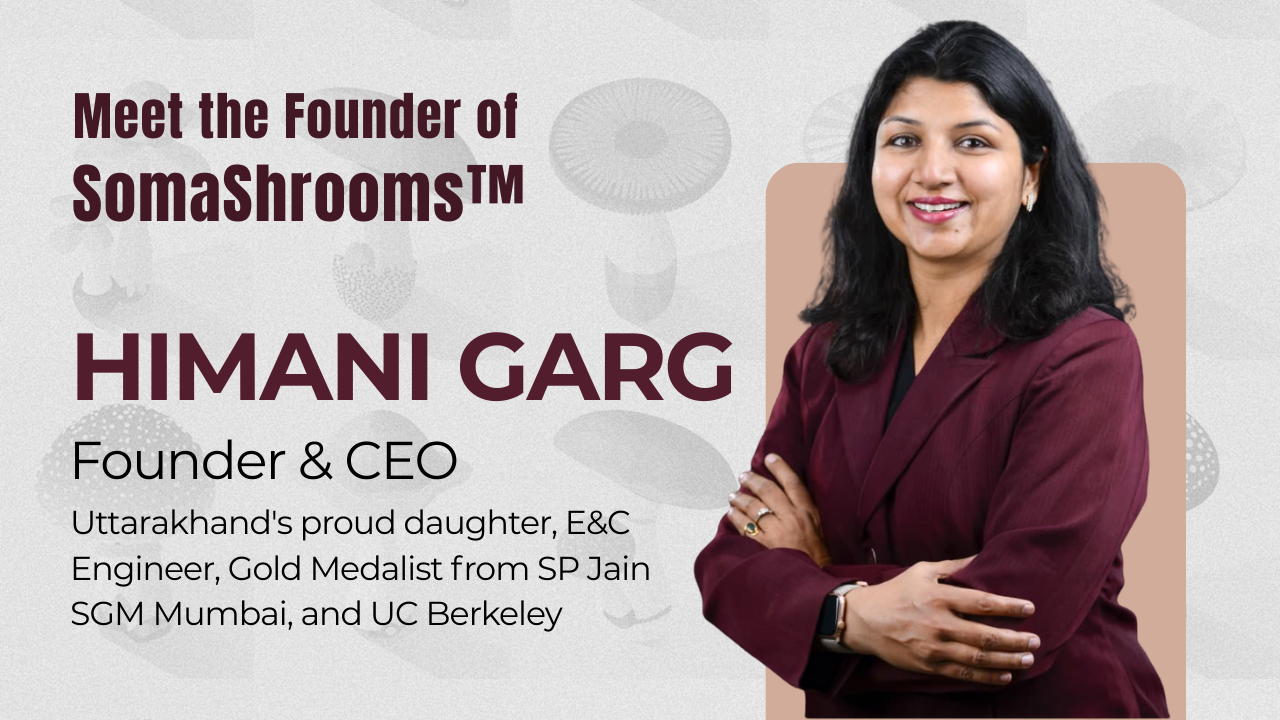SomaShrooms™ redefines wellness with carefully crafted functional mushroom supplements. Founded by Himani Garg, a passionate Uttrakhand Girl, an E&C Engineer and Gold Medalist Management Graduate from SP Jain SGM, Mumbai, who envisioned wellness as her Life Goal. She also accomplished a project with University of California, Berkley, on Information Technology. Born from a mother’s quest for purity and purpose, SomaShrooms™ grows, extracts, and formulates every product from spore to supplement to support your brain, gut, immunity, performance — naturally.
